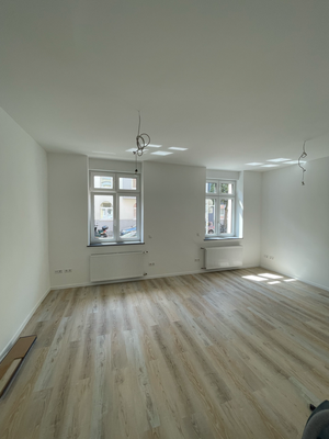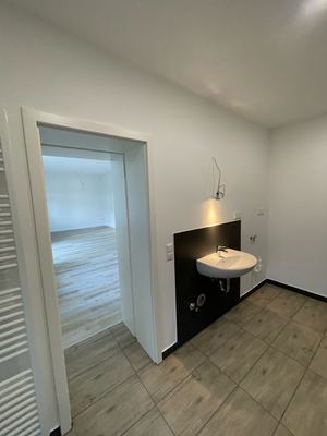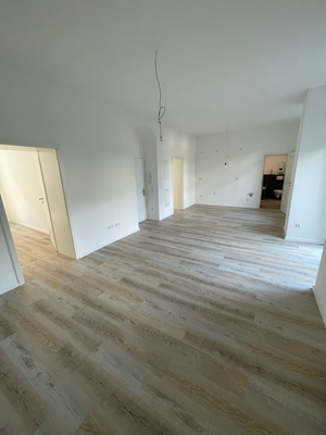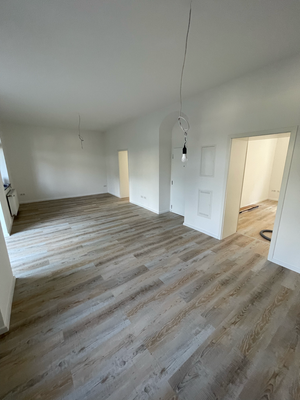 Die großzügigen Räume wurden mit hellen, eleganten Bodenbelägen ausgestattet, die den offenen Grundriss unterstreichen und dem Raum eine freundliche, einladende Atmosphäre verleihen. Glatt gespachtelte und frisch gestrichene Wände sorgen für Klarheit und eine hochwertige Ausstrahlung.