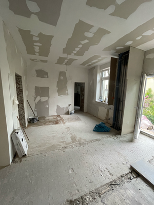 • Q4 gespachtelte, glatt verputzte und weiß gestrichene Wände