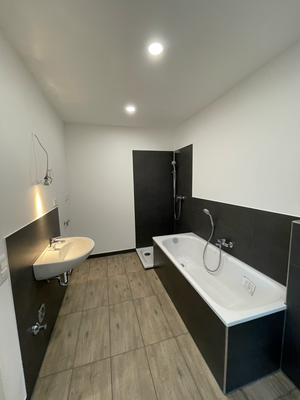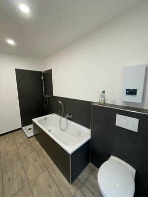 Das Bad wurde modernisiert und mit einer stilvollen Kombination aus dunklen und hellen Fliesen versehen. Die großflächigen Boden- und Wandfliesen in Holzoptik schaffen ein warmes Ambiente, während die dunklen Akzente an Dusche und Badewanne einen edlen Kontrast setzen. Eine neue Badewanne, moderne Armaturen und die integrierte Beleuchtung runden das Erscheinungsbild ab und sorgen für ein zeitgemäßes Wohlfühlbad.