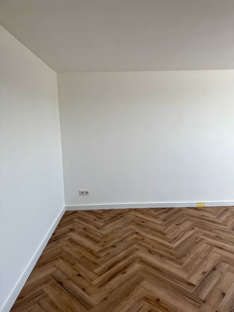 Die Wände wurden glatt gespachtelt, sauber weiß gestrichen und harmonieren perfekt mit dem warmen, in Fischgrät verlegten Vinylboden. Durch die Kombination von hochwertigen Materialien und präziser Ausführung entsteht ein elegantes, wohnliches Ambiente, das sowohl modern als auch langlebig ist.